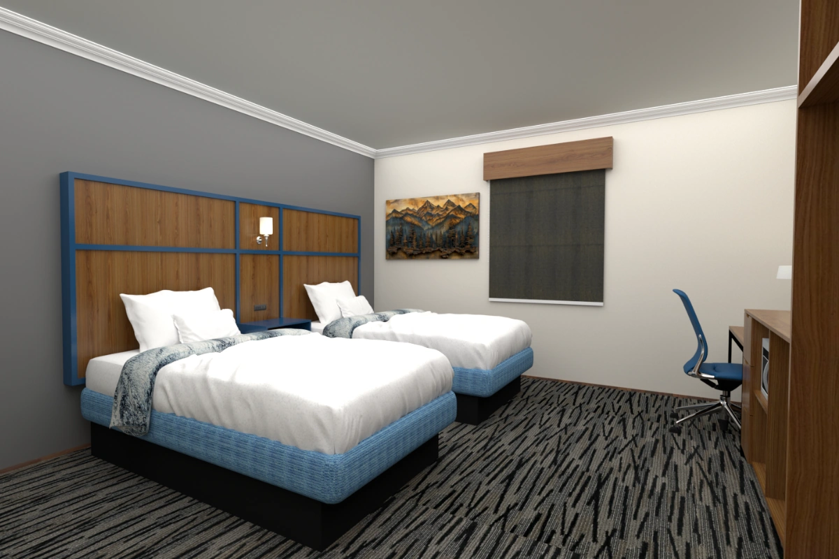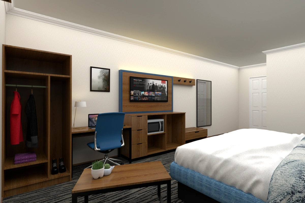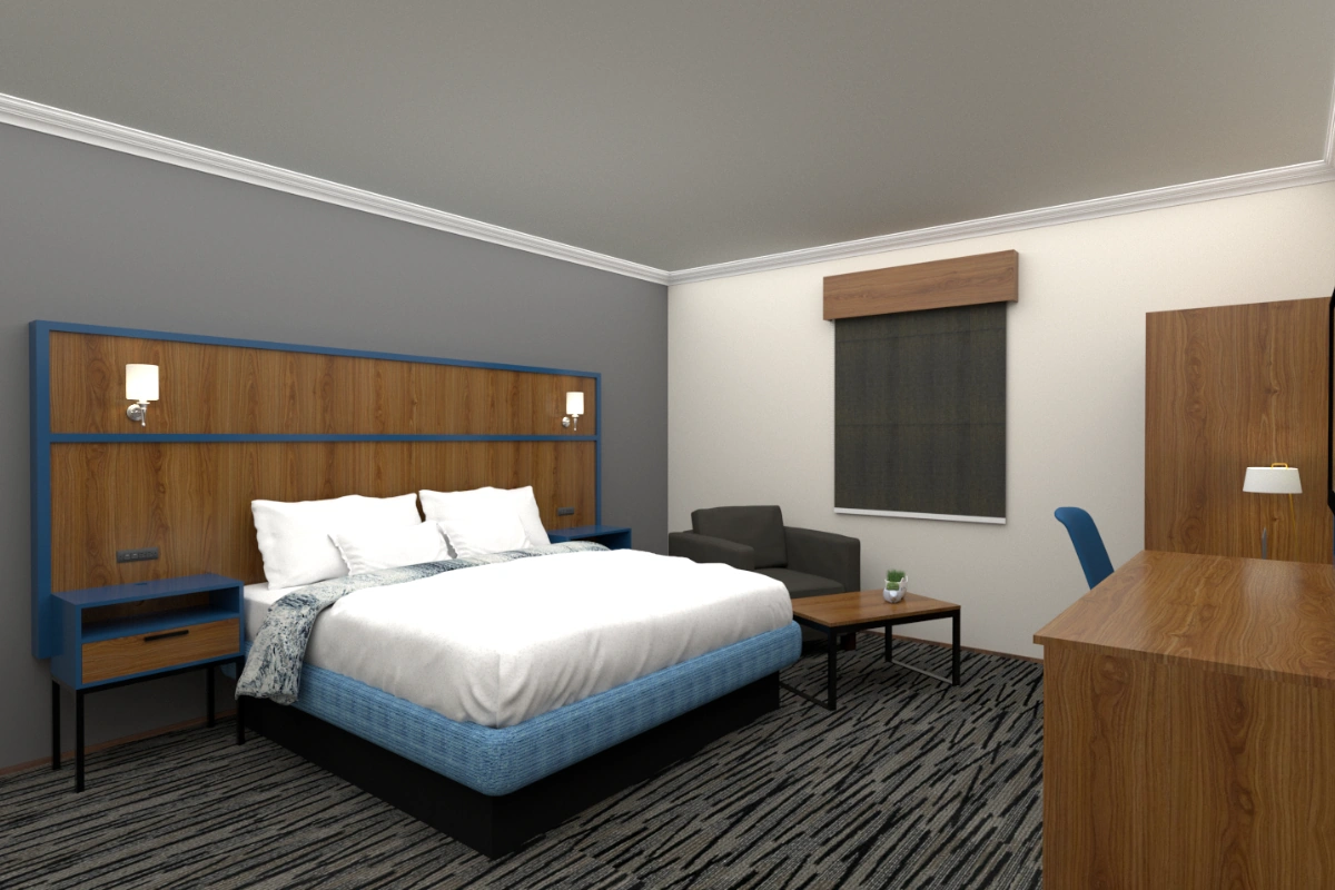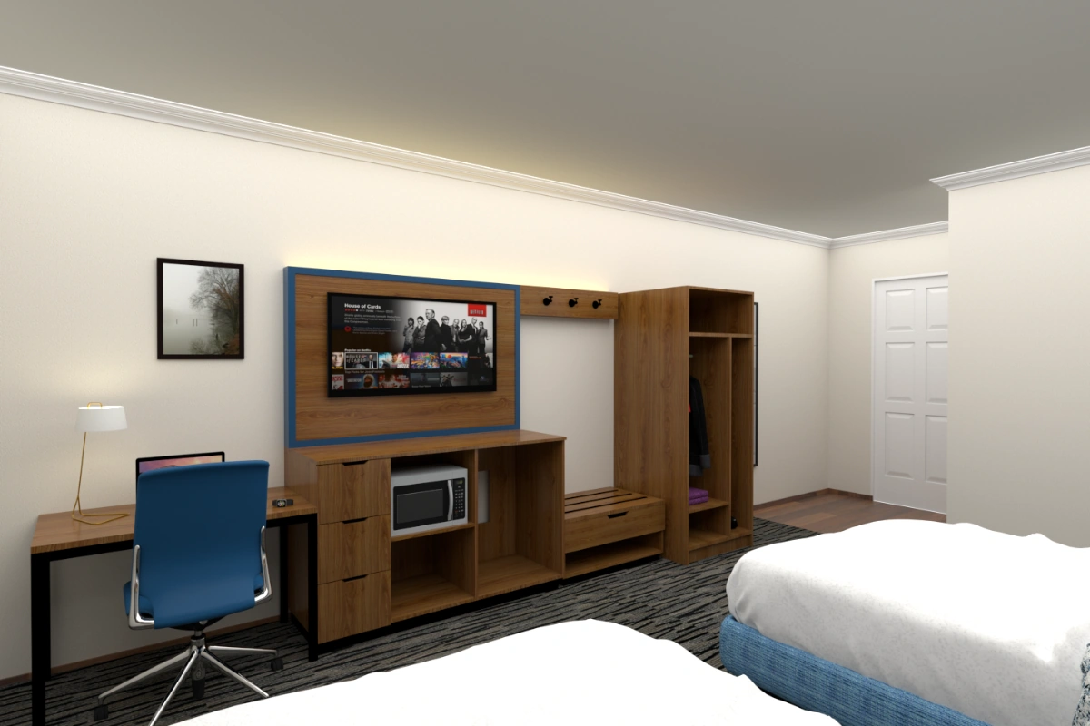 We designed and supplied furniture that captured AmericInn’s cozy, welcoming vibe. The case goods featured wood tones and textures that brought warmth to the rooms, while maintaining brand specifications and ensuring ease of maintenance for long-term hospitality use.